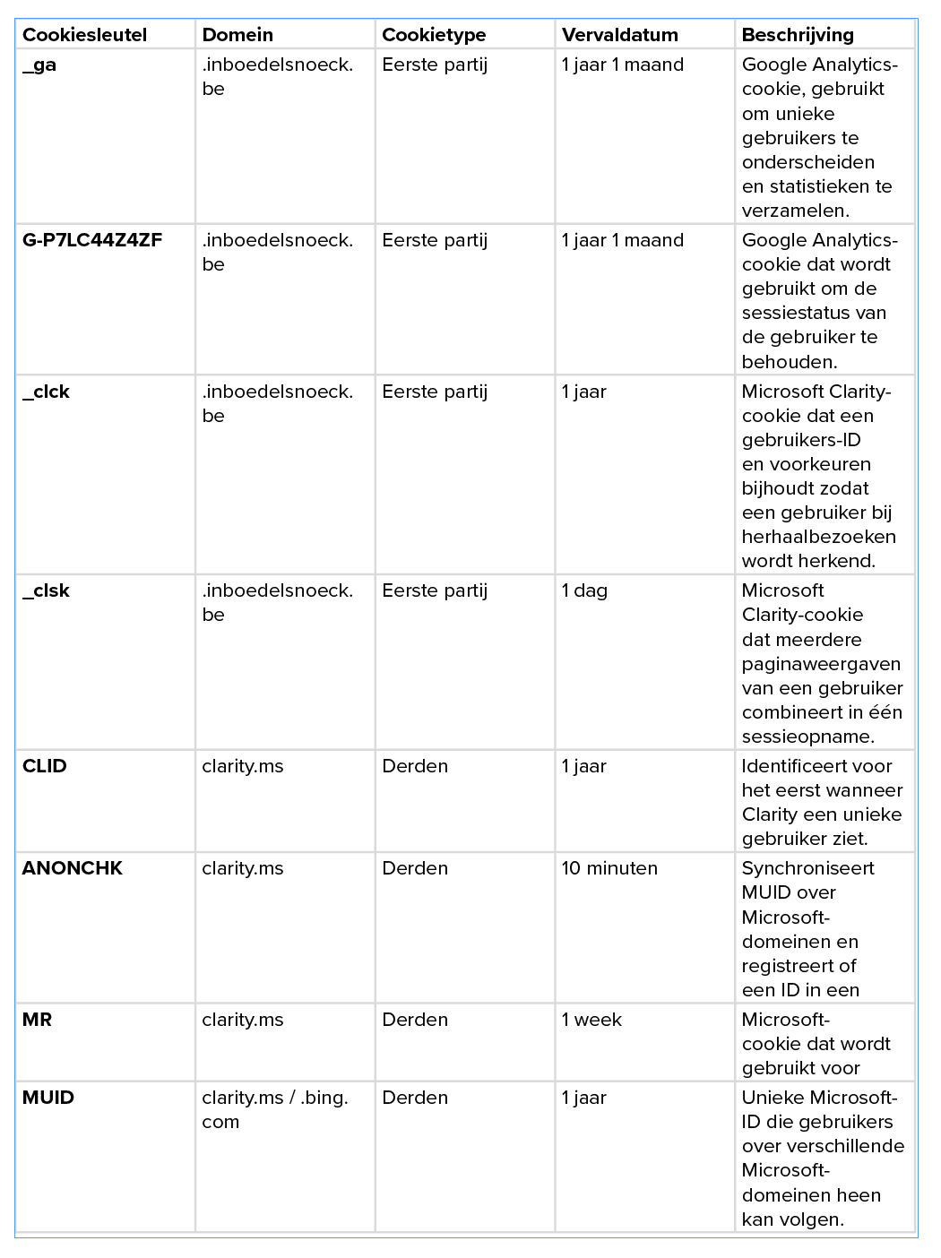 Artikel 4. Welke cookies gebruikt inboedel Snoeck, voor welk doel en wat is de geldigheidsduur?